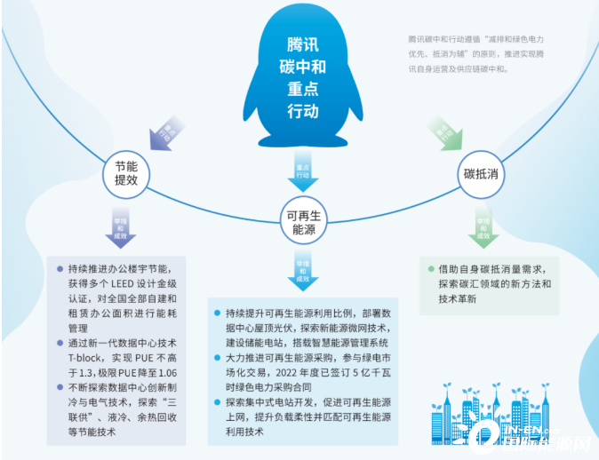 腾讯表示其碳中和行动将遵循“减排和绿色电力优先、抵消为辅”的原则,推进实现腾讯自身运营及供应链碳中和。具体共包含节能提效、可再生能源、碳抵消三大行动方向,从节能管理、创新节能技术、提升可再生能源利用比例、推进可再生能源采购和探索碳汇领域的新方法等多方面来实现。