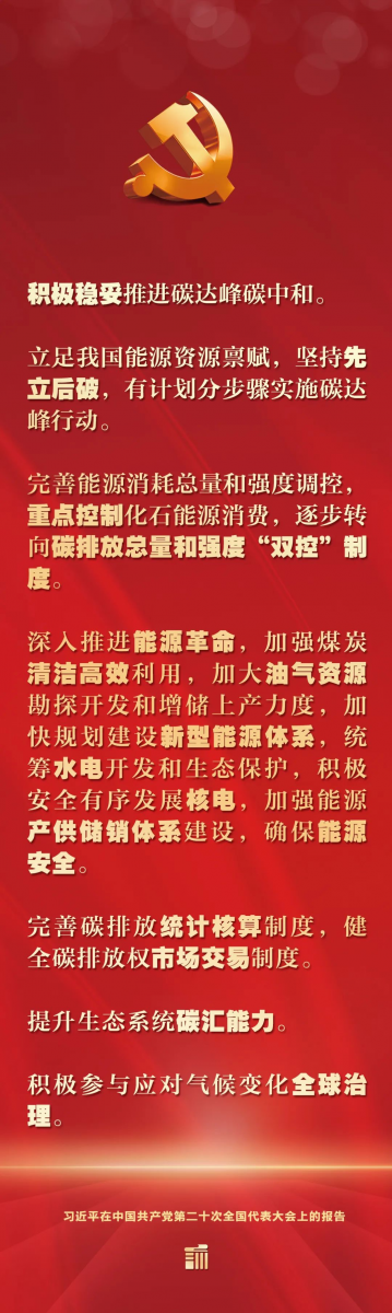 习近平总书记在二十大报告中明确提出:“积极稳妥推进碳达峰碳中和。立足我国能源资源禀赋,坚持先立后破,有计划分步骤实施碳达峰行动。