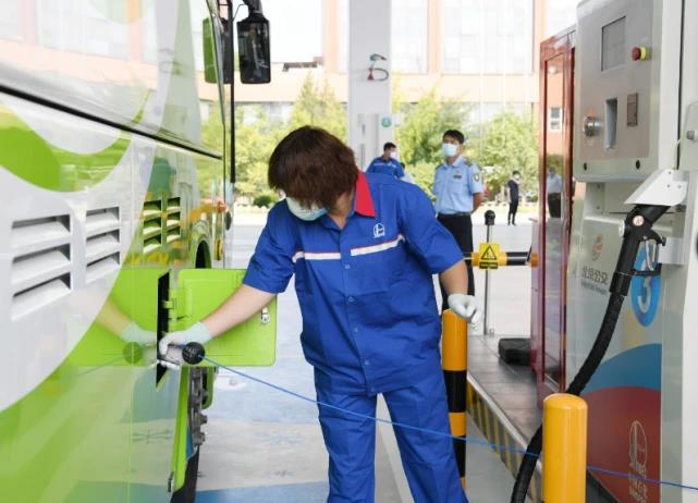 ▲工作人员为氢能源大巴车加注氢气。新京报记者 陶冉 摄