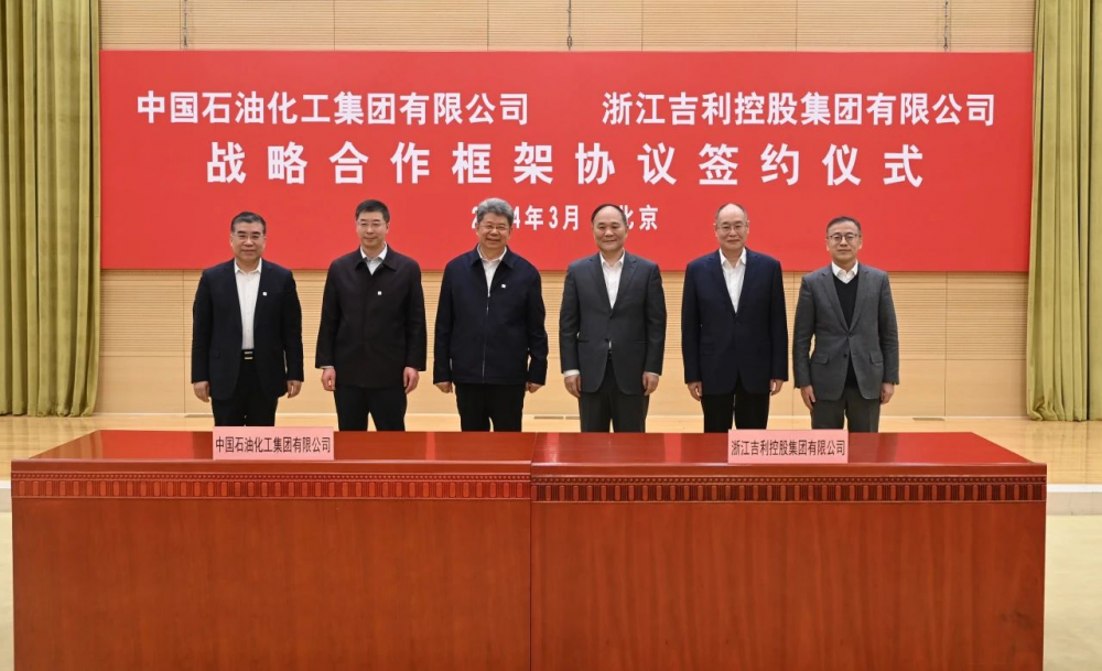 3月9日,吉利控股集团与中国石油化工集团在北京签署战略合作框架协议。中国石化集团公司董事长、党组书记马永生会见了吉利控股集团董事长李书福、副董事长杨健一行,并共同见证签约。根据协议,双方将深化绿色甲醇在内的多领域合作,助力打造稳定可靠、竞争力强的现代化产业链体系,以新质生产力,共同推动中国能源企业和汽车产业转型升级,为中国式现代化建设贡献力量。