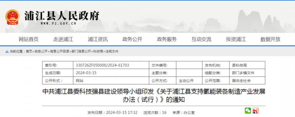 中共浦江县委科技强县建设领导小组印发《关于浦江县支持氢能装备制造产业发展办法(试行)》的通知