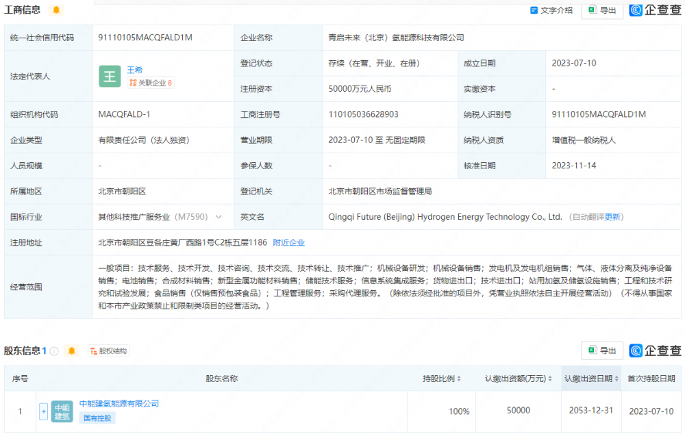 企查查信息显示,青启未来(北京)氢能源科技有限公司为中能建氢能源有限公司全资产业公司。
