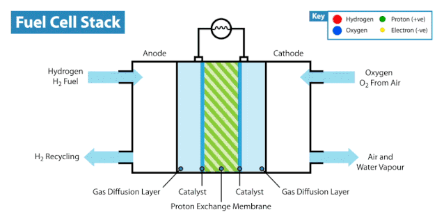 氢燃料电池工作原理是氢气通过燃料电池正极当中的催化剂(铂)分解成电子和氢离子(质子)。其中质子通过质子交换膜(Proton Exchange Membrane)到达负极和氧气反应变成水和热量。对应的电子则从正极通过外电路流向负极产生电能。