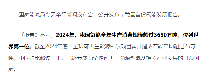 发布会介绍《中国氢能发展报告(2025)》相关情况。该报告显示,2024年中国氢能全年生产消费规模超3650万吨,位列世界第一位。
