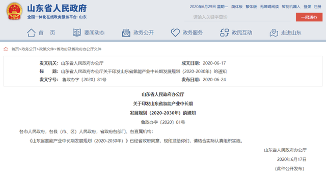 山东省政府办公厅正式发布《山东省氢能产业中长期发展规划(2020-2030年)》