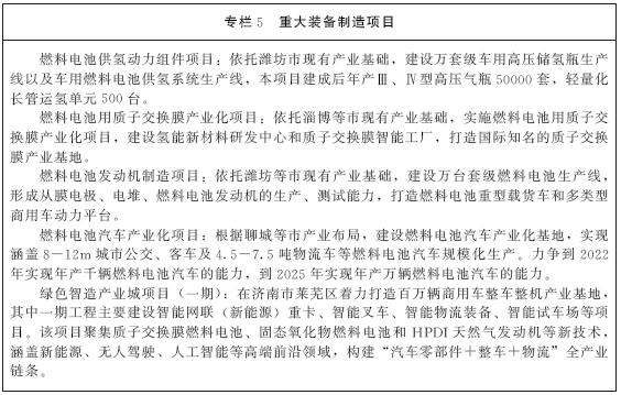 2.布局两大集群。形成以潍坊、淄博市为龙头的燃料电池及关键材料产业集群和以聊城、济宁市为龙头的燃料电池整车及氢能制储装备产业集群。其中,潍坊市重点打造世界领先的燃料电池发动机制造基地,淄博市重点打造燃料电池关键材料及核心部件产业基地,聊城市重点打造燃料电池整车研发制造基地,济宁市重点打造氢能制取储运装备产业基地。