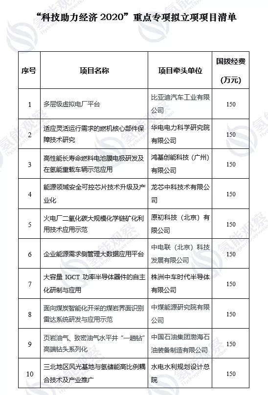 其中,10项应用中有2项与氢能相关:高性能长寿命燃料电池膜电极研发及在氢能重载车辆示范应用、三北地区风光基地与氢储能高比例耦合技术及产业推广。