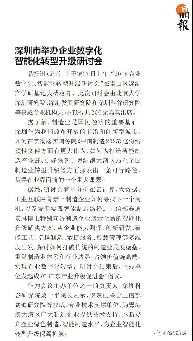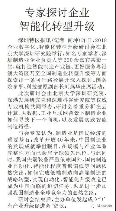 11月7日,由深圳星空真人研究院、北京大学深圳研究院和深港发展研究院等权威专业机构,共同打造的2018企业数字化-智能化转型升级研讨会圆满落幕,受到与会嘉宾的一致好评,《深圳特区报》、《深圳特区报》、《深圳晚报》、《晶报》、“深圳卫视”、“深圳财经生活频道”及“今日头条”、“亿欧网”等媒体均作了重点报道。