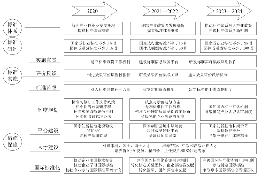 具体而言,标准化路线图分2020年、2021—2022年和2023—2024年三个时间段,从标准体系、标准研制、标准实施和保障措施四个方面进行阐述。标准体系主要是构建符合广东省氢燃料电池汽车产业发展的标准体系结构图,并不断完善改进。标准研制是根据技术成熟度和资源禀赋条件,制定多个层次的标准文本,补充完善标准体系下的标准。标准实施主要是开展标准宣贯、标准评价反馈、标准监督等工作。措施保障是从制度规划、平台建设、人才建设和国际标准化四个方面,阐述标准体系和规划路线图实施的支撑。