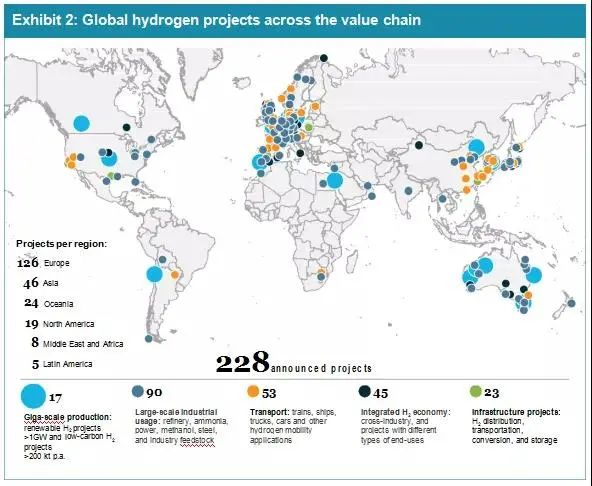在政府财政和监管的支持下,全球向脱碳方向的转变正支撑这一势头发展。国内生产总值占据世界一半以上的75个国家有零碳发展目标,30个有氢能规划。