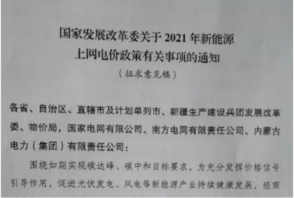 国家发改委近日就2021年新能源上网电价政策征求了相关部门意见,根据征求意见稿,2021年起新备案集中式光伏电站、工商业分布式光伏和新核准陆上风电项目,中央财政不再补贴。