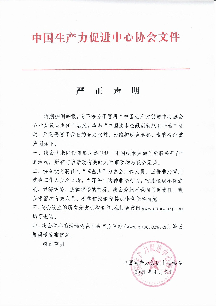 近期接到举报,有不法分子冒用“中国生产力促进中心协会专业委员会主任”名义,参与“中国技术金融创新服务平台”活动,严重侵害了我会的合法权益,为维护我会名誉,现我会郑重声明如下: