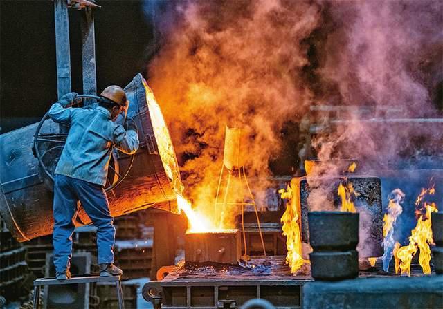 近年来,浙江诸暨姚江镇积极助推机床铸造业“煤转电”项目,助力企业实现硫化物零排放,低碳环保,高效节能。图为2021年4月15日,一名工人将浇铸包内的铁水倒入铸模内。 求是图片 郭斌/摄