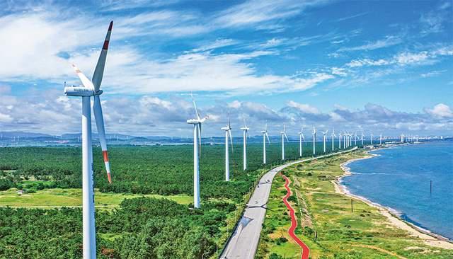 近年来,山东省荣成市坚持高质量绿色发展理念,推进风力发电、光伏发电等绿色经济产业发展,优化能源结构,助力推进碳达峰碳中和,实现生态保护和可持续发展。图为2021年8月24日,荣成市北部海湾附近,风力发电机组在运转发电。 求是图片 李信君/摄
