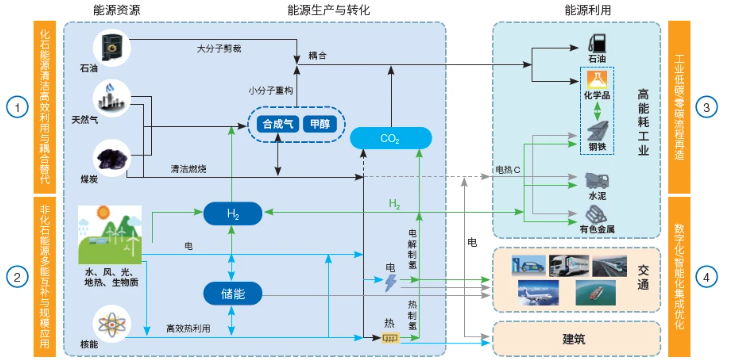 科技创新是支撑“双碳”目标实现的根本动力。经过多年发展,我国能源科技创新取得重要阶段性进展,有力保障了能源安全,促进了产业转型升级,为“双碳”目标的实现奠定了良好基础。但是,“双碳”目标下的能源结构、生产生活方式都将发生颠覆性变革,现有技术体系还难以支撑“双碳”目标的实现。要实现“双碳”目标,不仅需要突破各领域众多关键技术,更需要破除各能源种类及各能源相关行业之间的壁垒,跨领域突破多能融合互补及相关重点行业工业流程再造的关键瓶颈及核心技术,加强能源技术体系创新,重构能源及相关工业体系。跨领域系统化布局有巨大的创新空间,并带来巨大的总体节能减排效果,但同时也面临巨大挑战,是我国新能源体系构建和相关产业转型升级的重点方向和难点。