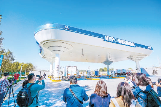 18日上午,部分境内外记者探访大兴国际氢能示范区,海珀尔加氢站吸引记者争相拍摄。本报记者 武亦彬摄