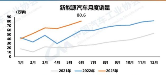 整体来看,2023年6月,新能源汽车产销分别完成78.4万辆和80.6万辆,同比分别增长32.8%和35.2%,市场占有率达到30.7%。其中,纯电动汽车产销分别完成54.8万辆和57.3万辆,同比分别增长17.5%和20.5%;插电式混合动力汽车产销分别完成23.5万辆和23.2万辆,同比分别增长90.5%和93.0%。
