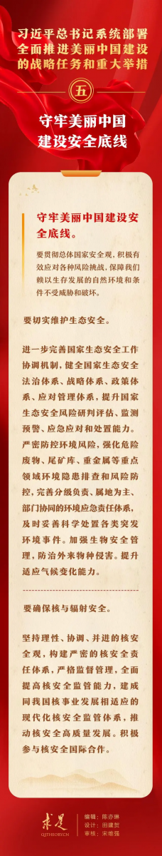 1月1日出版的第1期《求是》杂志刊发习近平总书记重要文章《以美丽中国建设全面推进人与自然和谐共生的现代化》。在这篇重要文章中,总书记从“持续深入打好污染防治攻坚战”、“加快推动发展方式绿色低碳转型”、“着力提升生态系统多样性、稳定性、持续性”、“积极稳妥推进碳达峰碳中和”、“守牢美丽中国建设安全底线”、“健全美丽中国建设保障体系” 6个方面,系统部署了全面推进美丽中国建设的战略任务和重大举措,为进一步加强生态环境保护、推进生态文明建设提供了方向指引和根本遵循。