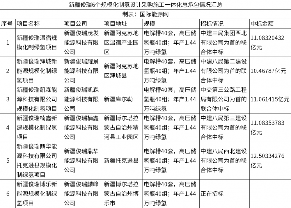 就在4月15日,另一个俊瑞字头的项目公布了设计采购施工一体化总承包中标公告:新疆俊瑞楠鑫新建规模化制绿氢项目设计采购施工一体化总承包中标结果显示,中建八局第三建设有限公司为牵头单位的联合体中标,中标金额11.08353783亿元。