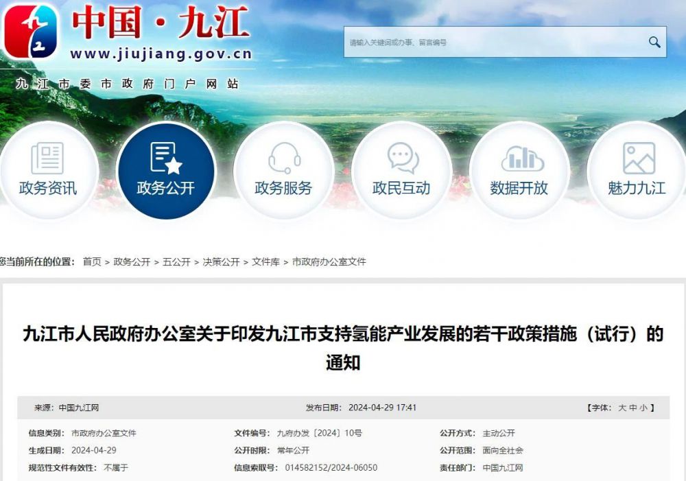 九江市支持氢能产业发展的若干政策措施(试行)