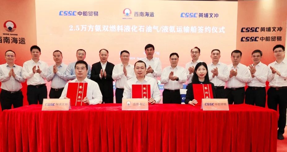 近日,由中国船舶集团上海船舶研究设计院设计、中船黄埔文冲船舶有限公司为天津西南海运有限公司建造的 2 艘 25000 方氨双燃料 LPG/液氨运输船在广州签约。上船院副院长周志勇出席签约仪式。