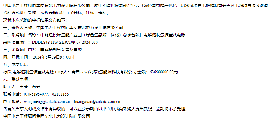 信息显示:中标人为青启未来(北京)氢能源科技有限公司,金额为636500000.00元。