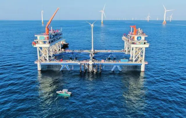 中广核“伏羲一号”是全部依靠绿色能源供能的大型风渔融合网箱平台,项目对于我国“海上风电+海洋牧场”产业融合发展具有重要示范意义。图为中广核“伏羲一号”风渔融合网箱平台(2024年9月2日摄)邓华摄/本刊