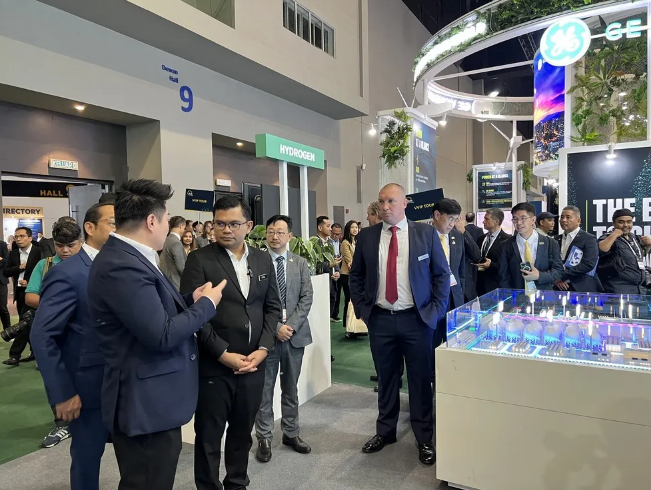 马来西亚能源转型与水务改革副部长哈吉阿卡马尔·纳斯鲁拉·莫哈末纳西尔在开幕式上致辞,并参观上海电气展台,对上海电气在马来西亚新能源领域投资和建设表示欢迎。