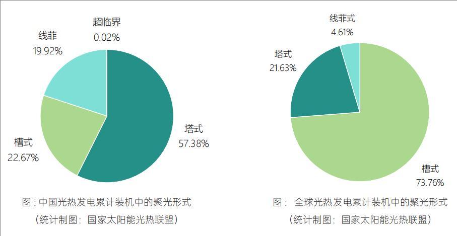 据国家太阳能光热联盟统计,中国光热发电累计装机中,熔融盐塔式(以下简称塔式)约占57.38%%、导热油槽式(以下简称槽式)约占22.67%、熔融盐线性菲涅尔式(以下简称线菲式)约占19.92%%、超临界二氧化碳约占0.02%;全球光热发电累计装机中,塔式、槽式、线菲式分别约占21.63%、73.76%、4.61%。