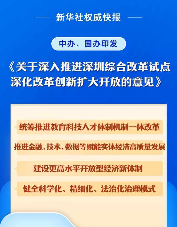 新华社北京6月11日电 《经济参考报》6月11日刊发记者梁倩采写的文章《重磅文件深入推进深圳综合改革试点》。文章称,6月10日,中办、国办印发的《关于深入推进深圳综合改革试点深化改革创新扩大开放的意见》(以下简称《意见》)正式公开。《意见》明确,在更高起点、更高层次、更高目标上深化改革、扩大开放,创造更多可复制、可推广的新鲜经验,更好发挥深圳在粤港澳大湾区建设中的重要引擎作用和在全国一盘棋中的辐射带动作用,为全面建设社会主义现代化国家作出贡献、提供范例。