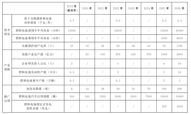 文件对山东省氢能产业发展目标做了详细规定。根据文件要求,山东省在2022年氢能产业总产值规模突破200亿元,累计建成加氢站30座,省域内累计示范推广燃料电池汽车3000辆左右;到2025年,氢能产业总产值规模突破1000亿元,累计建成加氢站100座,累计推广燃料电池汽车10000辆;到2030年,氢能产业总产值规模突破3000亿元,累计建成加氢站200座,累计推广燃料电池汽车50000辆。