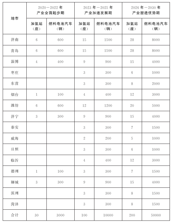 2.布局两大集群。形成以潍坊、淄博市为龙头的燃料电池及关键材料产业集群和以聊城、济宁市为龙头的燃料电池整车及氢能制储装备产业集群。其中,潍坊市重点打造世界领先的燃料电池发动机制造基地,淄博市重点打造燃料电池关键材料及核心部件产业基地,聊城市重点打造燃料电池整车研发制造基地,济宁市重点打造氢能制取储运装备产业基地。