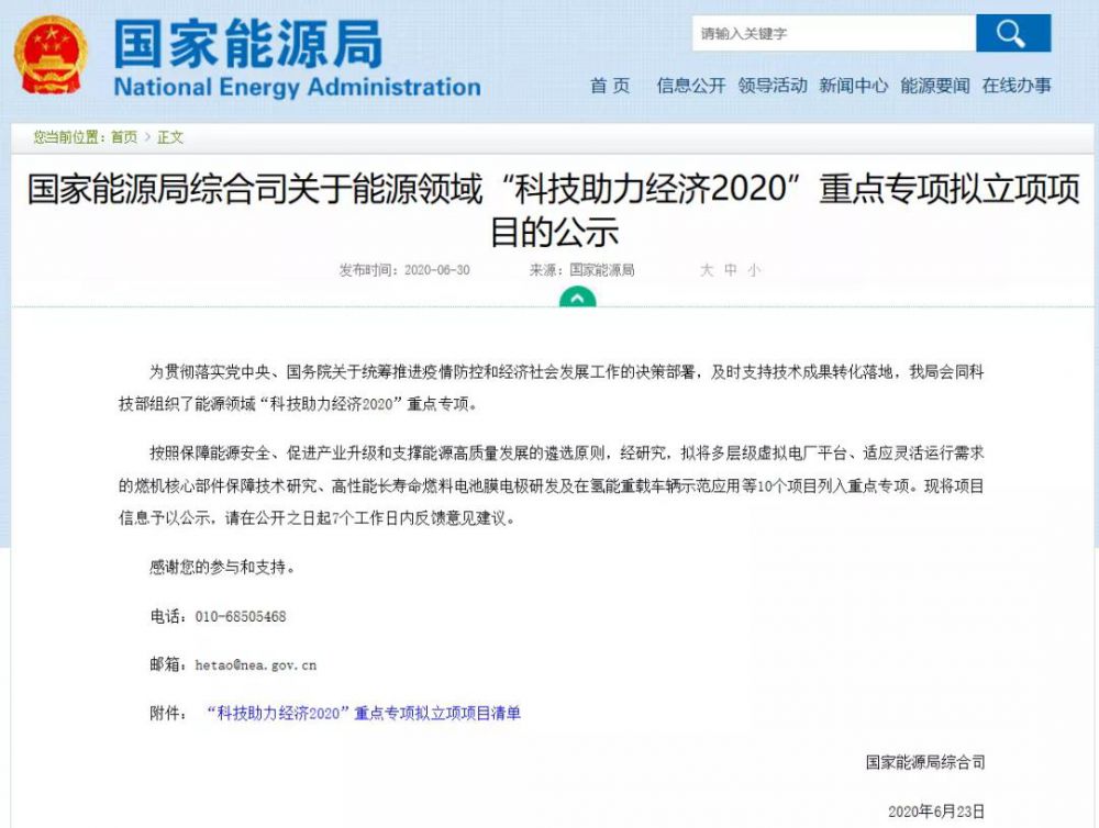 6月30日,国家能源局综合司发布《关于能源领域“科技助力经济2020”重点专项拟立项项目的公示》,按照保障能源安全、促进产业升级和支撑能源高质量发展的遴选原则,经研究,拟将多层级虚拟电厂平台、适应灵活运行需求的燃机核心部件保障技术研究、高性能长寿命燃料电池膜电极研发及在氢能重载车辆示范应用等10个项目列入重点专项。现将项目信息予以公示,请在公开之日起7个工作日内反馈意见建议。