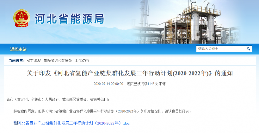 近日,从河北省能源局官网上了解到,经河北省政府同意,《河北省氢能产业链集群化发展三年行动计划(2020-2022年)》(以下简称“计划”)正式对外印发。