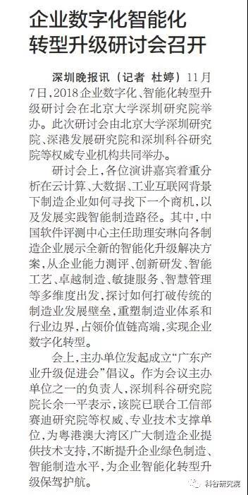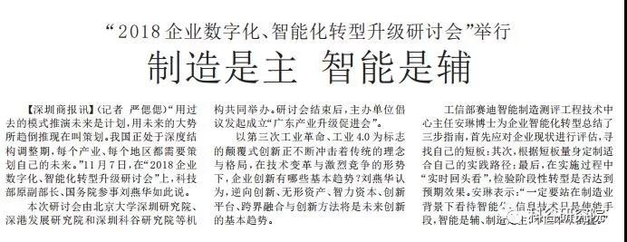 11月7日,由深圳星空真人研究院、北京大学深圳研究院和深港发展研究院等权威专业机构,共同打造的2018企业数字化-智能化转型升级研讨会圆满落幕,受到与会嘉宾的一致好评,《深圳特区报》、《深圳特区报》、《深圳晚报》、《晶报》、“深圳卫视”、“深圳财经生活频道”及“今日头条”、“亿欧网”等媒体均作了重点报道。