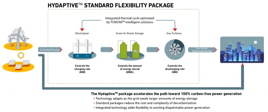 三菱发电公司推出的解决方案包括Hydaptive套件和Hystore套件。Hydaptive软件旨在通过近乎瞬时的功率平衡资源来提供可再生能源的灵活性,从而极大地增强了简单循环或联合循环电厂增/减功率的能力来加强电网平衡服务的能力。它将燃气轮机发电厂与电解制氢装置集成在一起,同时结合现场氢气存储,从而生产100%可再生电力。