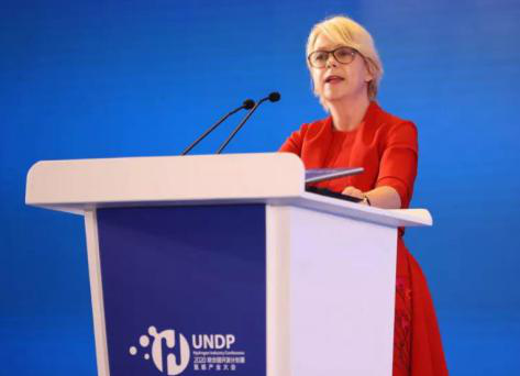 左图:联合国开发计划署驻华代表白雅婷(Beate Trankmann)致辞