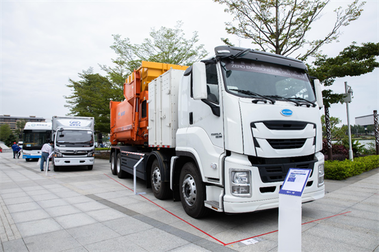 PRISMA镜星系列产品是完整基于正向开发,模块化集成,能实现零下30度启动,设计寿命达到约3万小时。系统中采用基于场景需求,定制化开发的电堆、DC/DC,以及燃料电池控制器。目前已有18吨至49吨共5款燃料电池重卡采用该系列产品,应用于工业品运输、城际高速物流、专线货运、渣运、市政服务等领域,其中就包括了在展会现场亮相的一辆31吨燃料电池垃圾清运车。