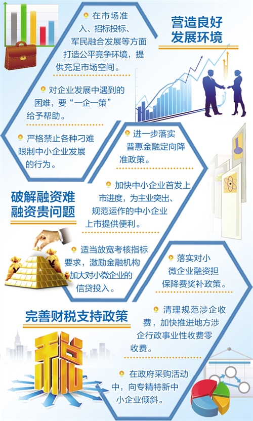 中小企业是国民经济和社会发展的生力军,是扩大就业、改善民生、促进创业创新的重要力量,在稳增长、促改革、调结构、惠民生、防风险中发挥着重要作用。党中央、国务院高度重视中小企业发展,在财税金融、营商环境、公共服务等方面出台一系列政策措施,取得积极成效。同时,随着国际国内市场环境变化,中小企业面临的生产成本上升、融资难融资贵、创新发展能力不足等问题日益突出,必须引起高度重视。为促进中小企业健康发展,现提出如下意见。